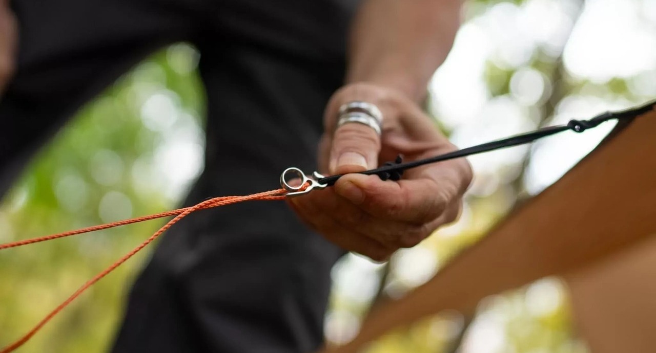 海外ではタープに過度な負担が掛からないよう、タープループにショックコードで作られたループをセットしガイラインにテンションを掛けます。