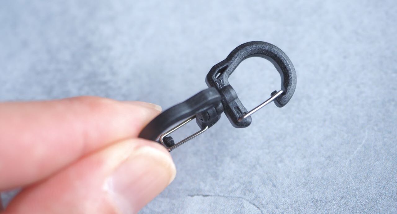全長30mm強のダブルカラビナ、重量も約1.5gと超軽量です。